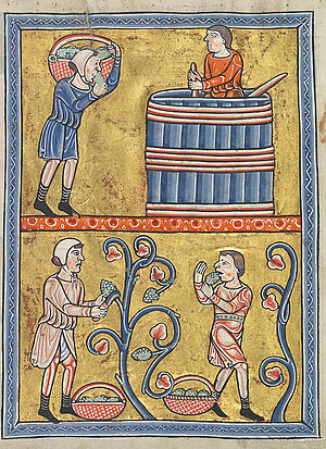 Das verliehene Gebiet umfasste oftmals Hunderte von Höfen samt Winzer:innen und Weinbergen, Mühlen und Märkten. Um diese in einer Zeit ohne Landkarten und Schriftkenntnis zu organisieren, wurden die Lehen weiter unterteilt. Hierbei bildeten Fronhöfe samt angrenzender Nebenhöfe – Hufen – die kleinste Einheit. Halbbauern nahmen eine halbe Hufe und Drittelbauern eine Drittelhufe zu Lehen. Der Lehnsherr beanspruchte hierfür die Hälfte oder ein Drittel des Ertrags vom Feld und aus dem Weinberg. [Anm. 2] Zudem fielen Frondienste an – die herrschaftlichen Ländereien mussten mit bestellt werden. Bauern und Bäuerinnen durften hierfür als Winzer:innen in den fürstlichen Weinbergen agieren. Im Gegenzug gewährte der Lehnsherr Ländereien und seinen Schutz. So boten beispielsweise die Mauern der Burg Trifels Zuflucht vor feindlichen Raubzügen und marodierenden Banden.