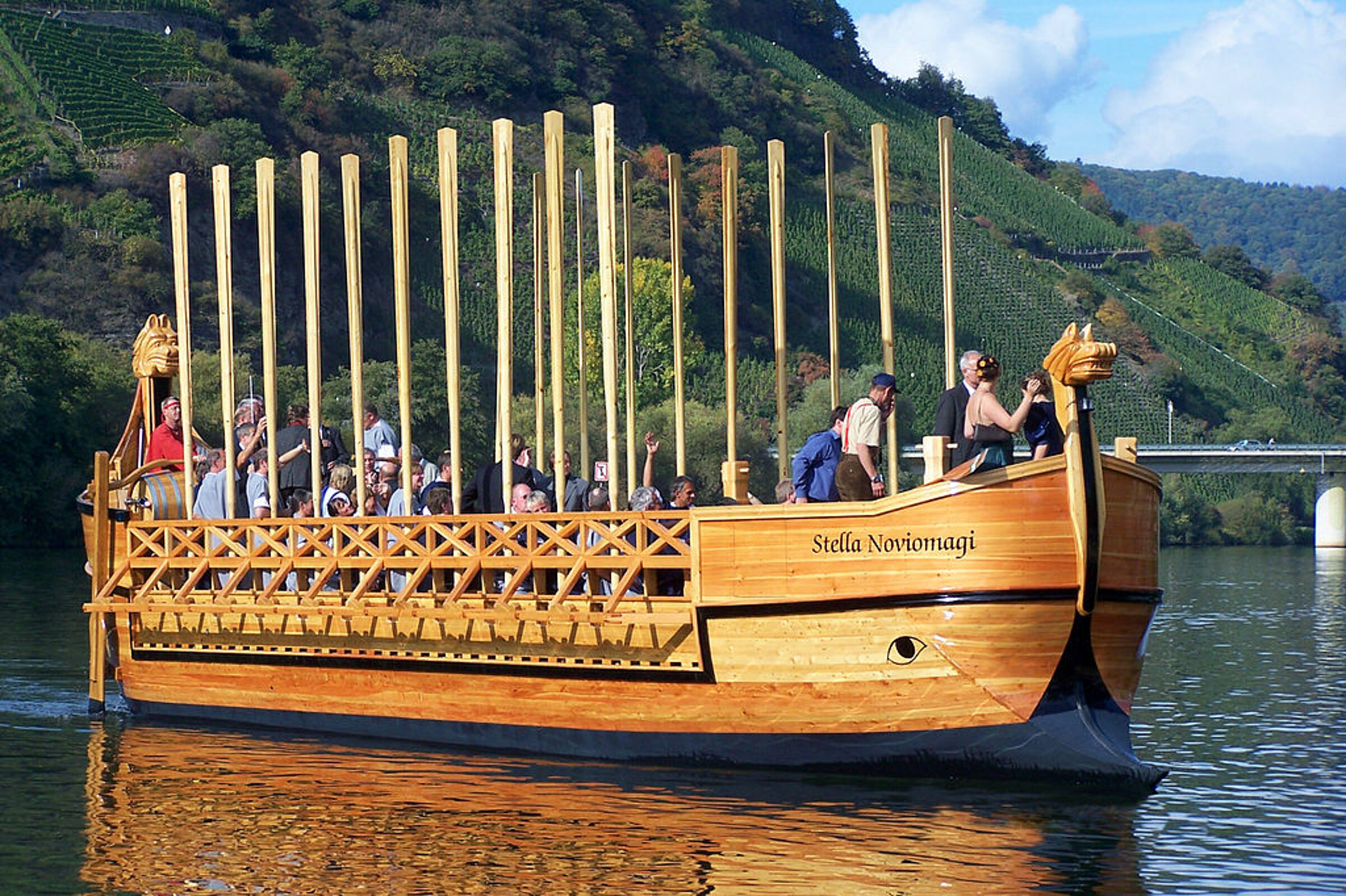 Dass die Mosel eine solche Lebensader für den Weintransport war, bezeugen die 4 Figuren von Weinschiffen, die in der Festung der römischen Handelsstadt Noviomagus Treverorum (heute: Neumagen-Dhron) gefunden wurden. Diese Monumente, die wohl zum Grabmal eines Trierer Weinhändlers gehörten, [Anm. 8] zeigen außerdem eine Besonderheit des Weintransports auf der Mosel: Statt der im Mittelmeerraum üblichen Amphoren übernahmen die Römer:innen hier die keltischen Holzfässer, die bei guter Transportfähigkeit wesentlich mehr Wein fassen und den Weinbedarf der Armee so leichter decken konnten. [Anm. 9]